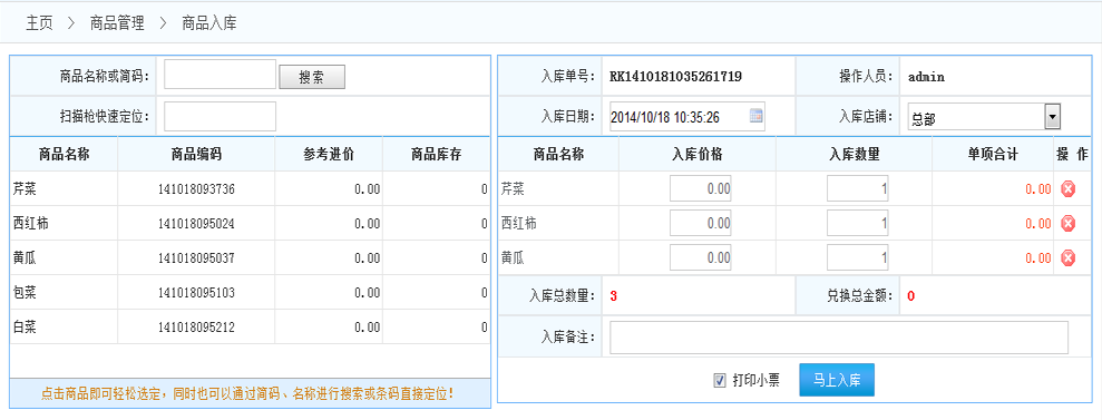 商品入庫:點擊進入商品入庫界面 如下圖:
