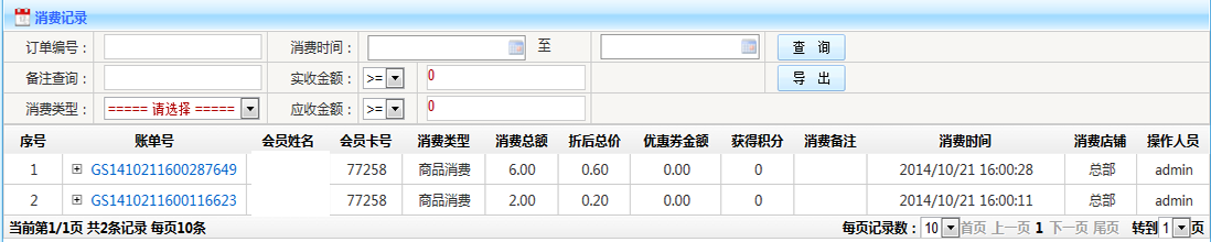 1.查詢:可以根據(jù)消費(fèi)單號(hào) 時(shí)間段 消費(fèi)類型等條件查詢