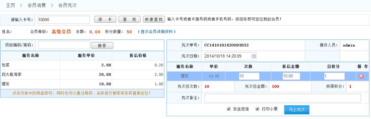 先會員刷卡定位到會員,然后輸入商品的名稱或簡碼或者掃描槍快速定位查找商品;或先會員刷卡,然后輸入充次項目編碼或簡碼查找服務項目;或者直接點擊服務項目;選擇服務項目后點擊結算此訂單如圖顯示: