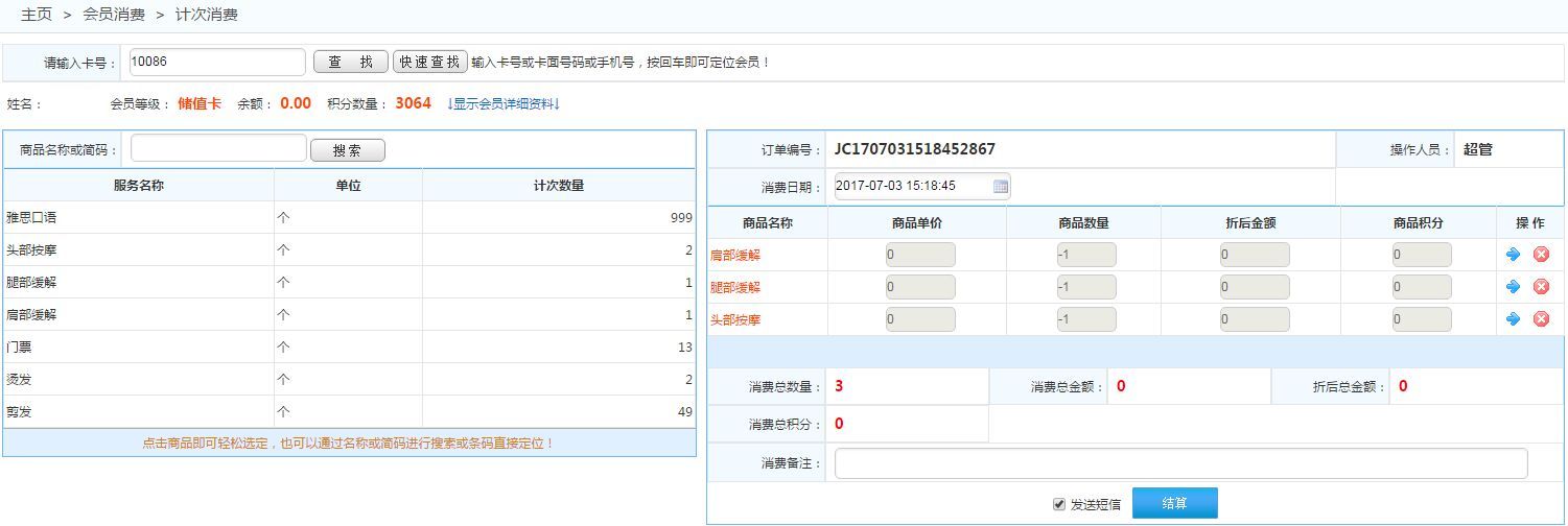 計(jì)次消費(fèi):通過(guò)刷卡,或者通過(guò)查詢(xún)定位到會(huì)員,然后在左側(cè)選擇服務(wù)類(lèi)型商品進(jìn)行計(jì)次消費(fèi)  如下圖: