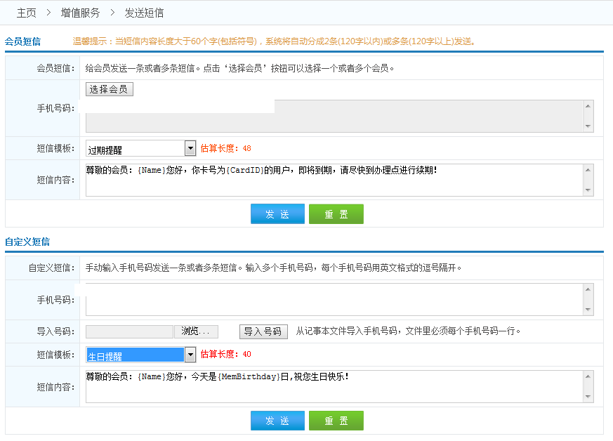 自定義短信:手動輸入手機號碼發(fā)送一條或者多條短信。輸入多個手機號碼,每個手機號碼用英文格式的逗號隔開。